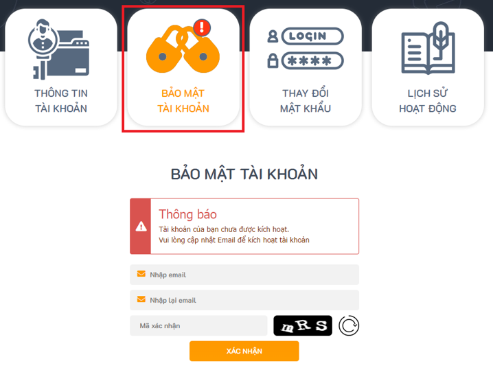 - Bước 2: Bấm chọn ô Bảo mật tài khoản và nhập mã kích hoạt tương ứng (Vui lòng nhập đúng chữ in hoa và in thường).