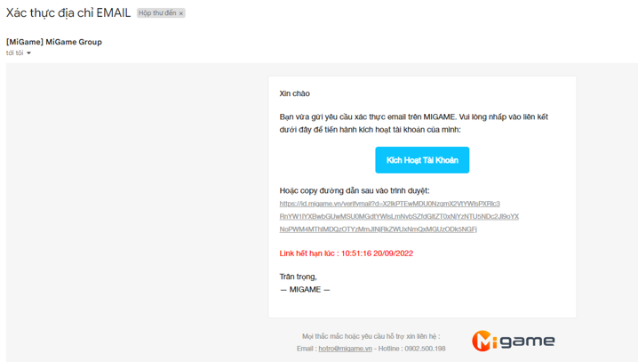 - Bước 3: MiGame sẽ gửi email xác thực đến địa chỉ email mà Điều Tra Viên đã đăng ký. Vui lòng kiểm tra email và click vào link để kích hoạt tài khoản