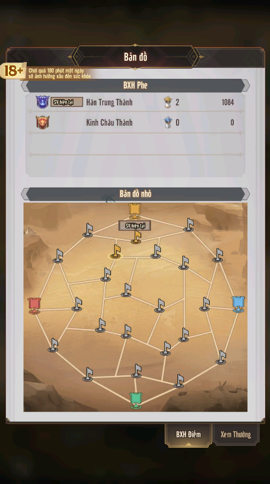 - Ưu tiên chiếm thành nhiều điểm tích lũy: Hãy nhìn trên bản đồ nhỏ để xác định các thành trì có đường nối quan trọng và mang lại nhiều Đá Hoàng Thành /Điểm Tích Lũy hơn.