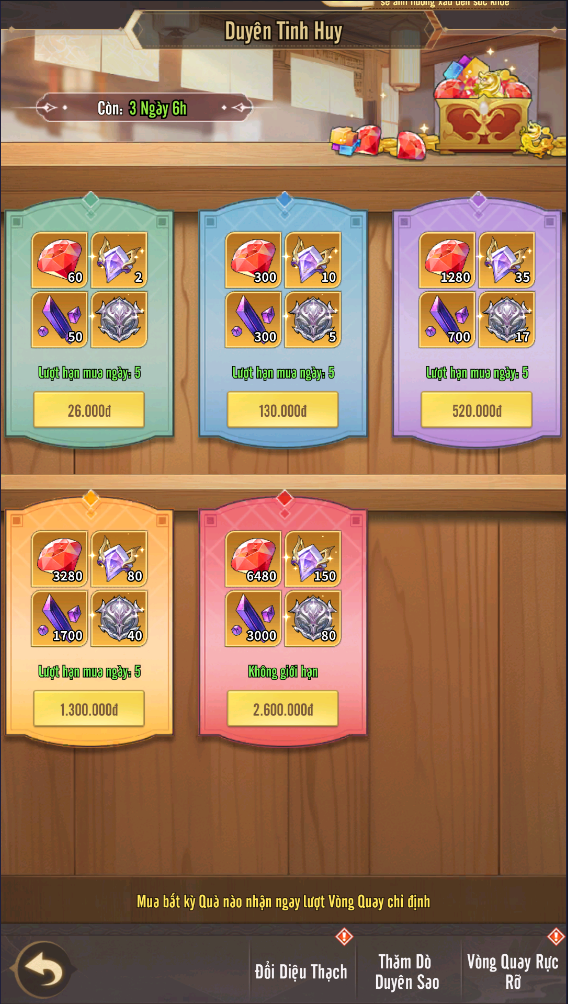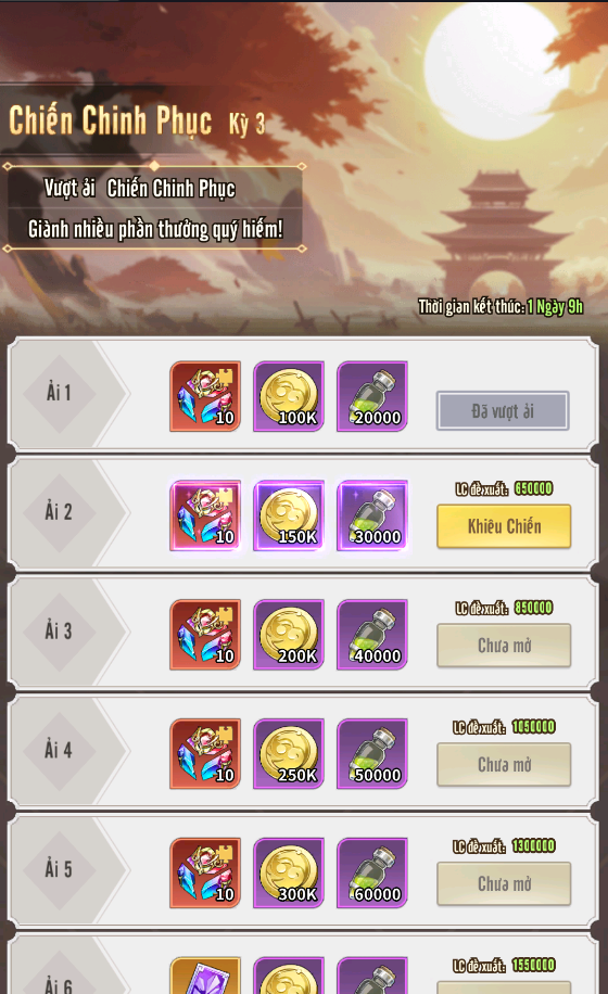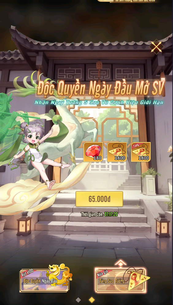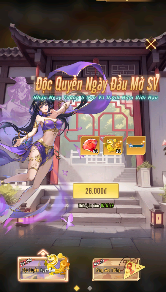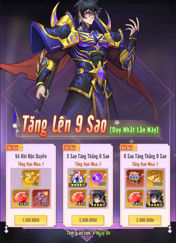 + Tăng Thẳng 9 Sao: Gói quà ưu đãi bao gồm Thần Khí Linh Hồn độc quyền của Lữ Bố, gói tăng từ 5 sao lên 6 sao và gói tăng từ 6 sao lên 9 sao, chỉ xuất hiện duy nhất trong sự kiện này.