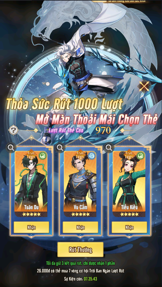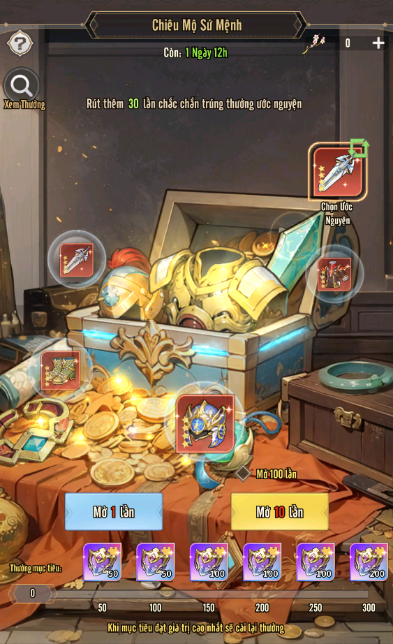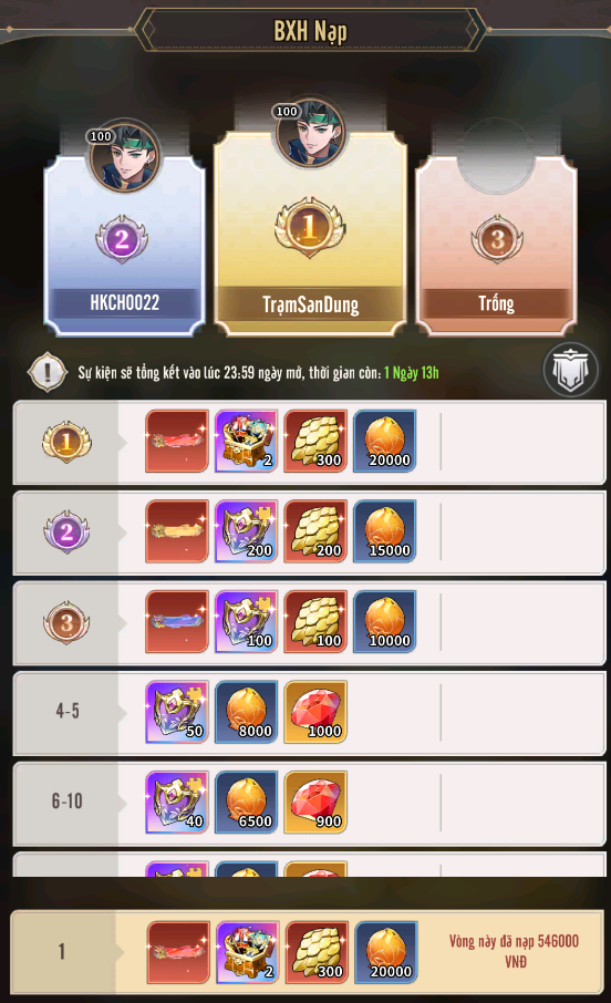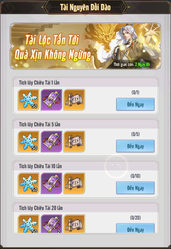 + Tài Nguyên Dồi Dào: tích lũy số lần chiêu tài tiến bảo đạt yêu cầu có thể nhận thưởng.
