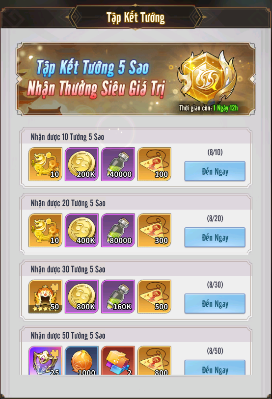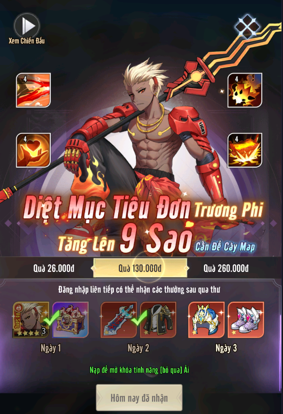 + Ngày 1 nhận 3 Võ Tướng Trương Phi và nguyên liệu đủ để nâng lên 9 sao.