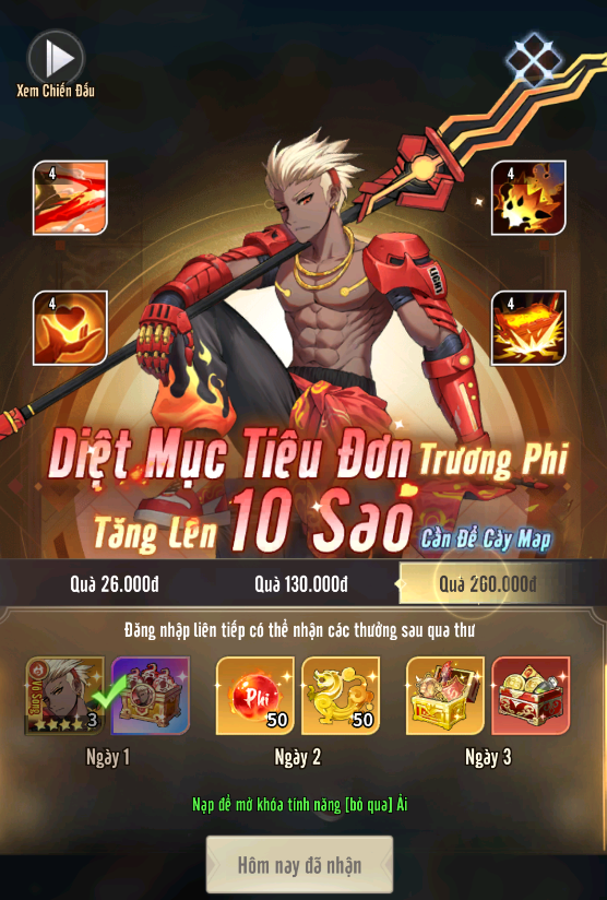 + Ngày 1 nhận 3 Võ Tướng Trương Phi và nguyên liệu đủ để nâng lên 10 sao.