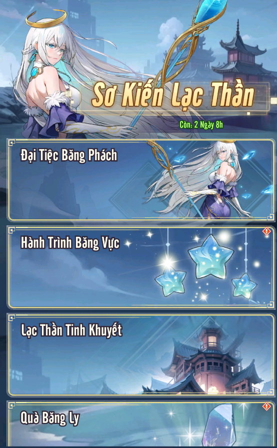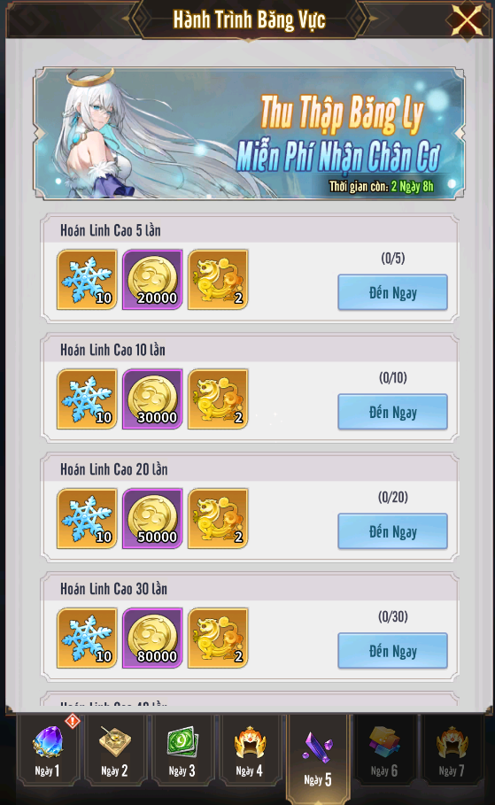 + Hành Trình Băng Vực: kéo dài 7 ngày, mỗi ngày là 1 chuỗi nhiệm vụ khác nhau với những phần thưởng phong phú bao gồm Băng Ly và nhiều phần quà giá trị khác.