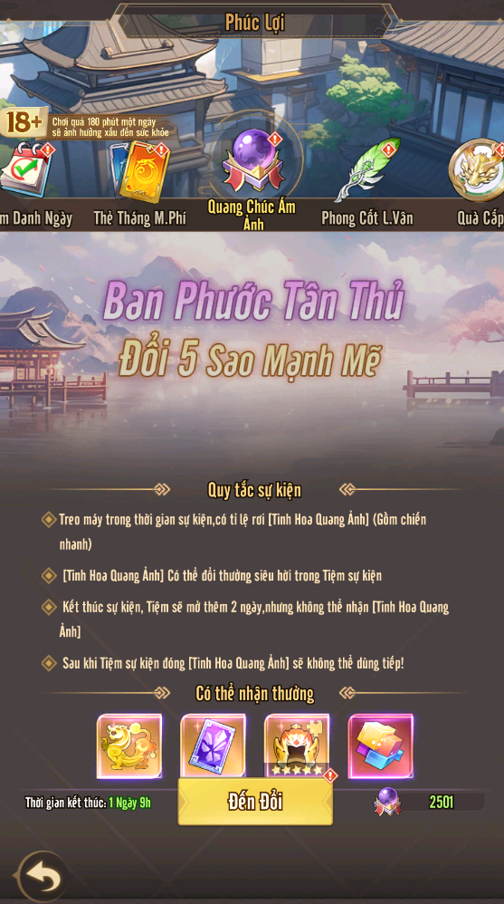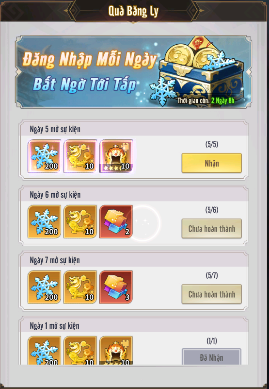 + Quà Băng Ly: mỗi ngày đăng nhập nhận Băng Ly cùng nhiều phần thưởng phong phú.