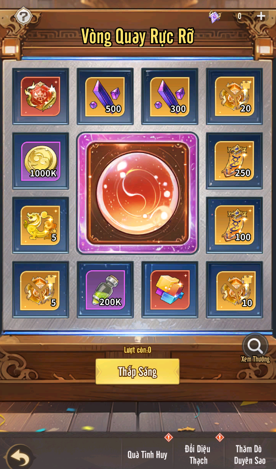 + Thăm Dò Duyên Sao: khi Điều Tra Viên thắp sắng vòng quay rực rỡ đạt được số lượt yêu cầu sẽ nhận được thêm nhiều phần thưởng giá trị. Đặc biệt khi đạt đủ 250 lượt quay Điều Tra Viên sẽ nhận đủ 100 mảnh Ma Huy Thiên Vận để ghép lại tạo ra Ma Huy Thiên Vận Ngũ Sắc vô cùng giá trị.
